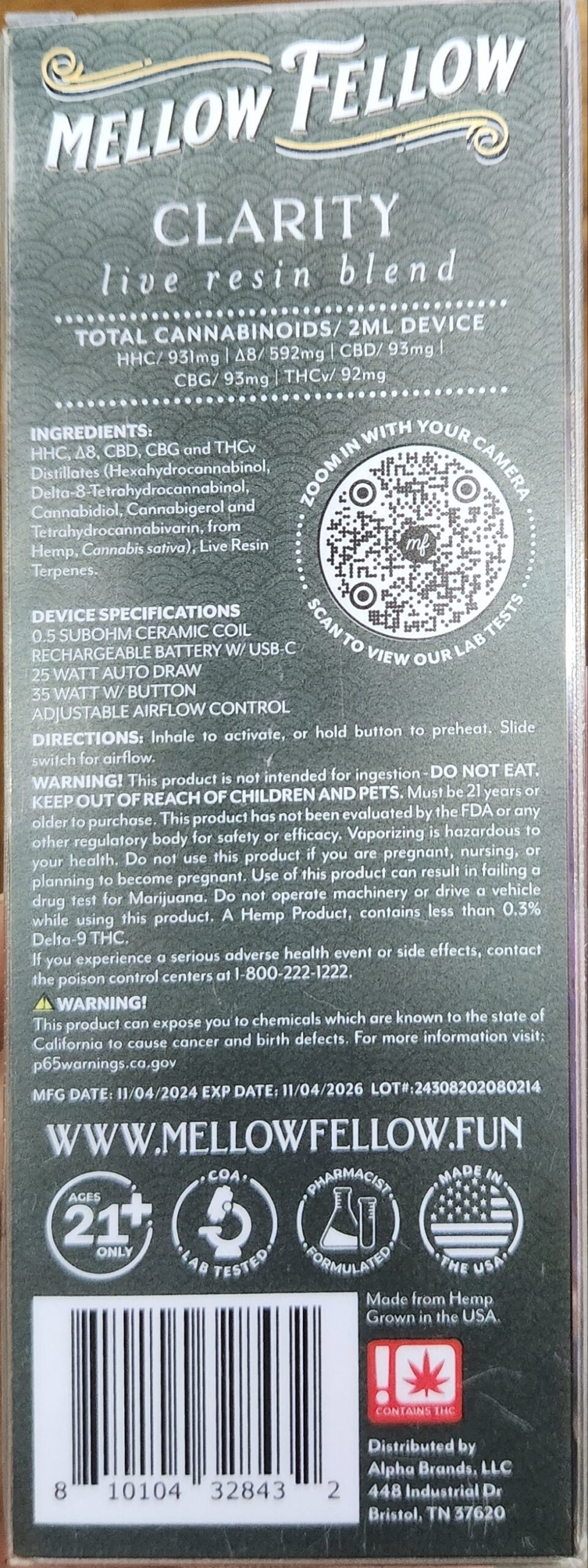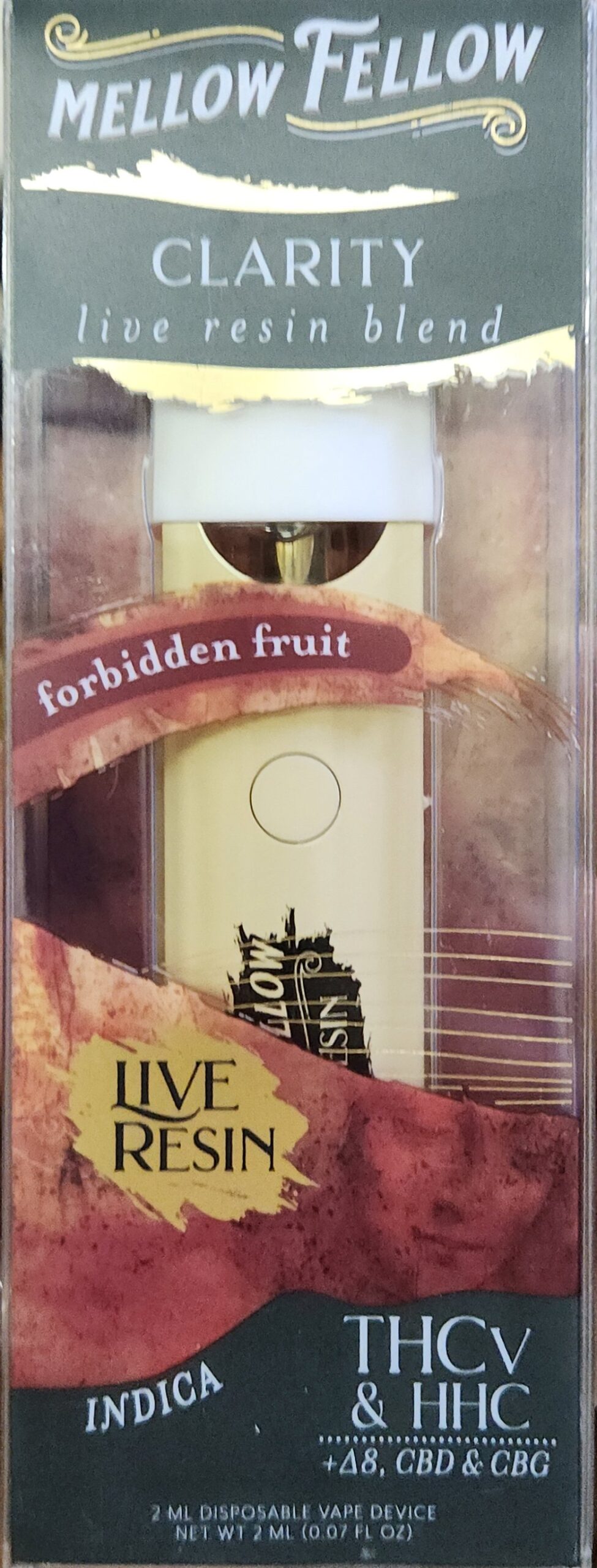 Mellow, fellow clarity live resin blend forbidden fruit THC V and HHC plus Delta 8 CV D and CBG2 milliliter disposable vape. Device net weight two milliliters, zero point 07 fluid ounces